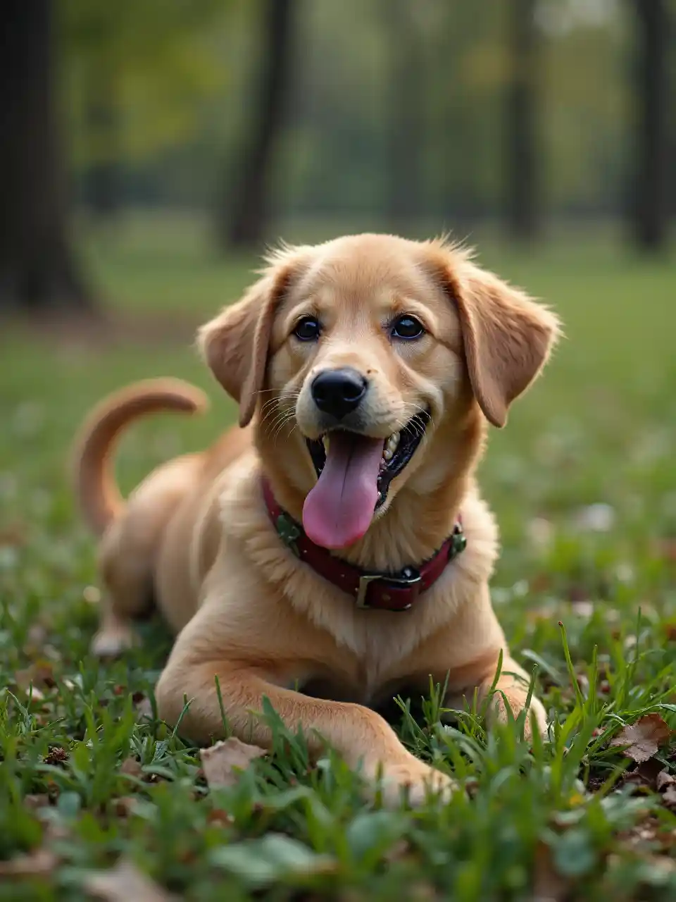 Parc, collier, couché comme un chiot, nu, langue tirée, queue de chat bouchée anale