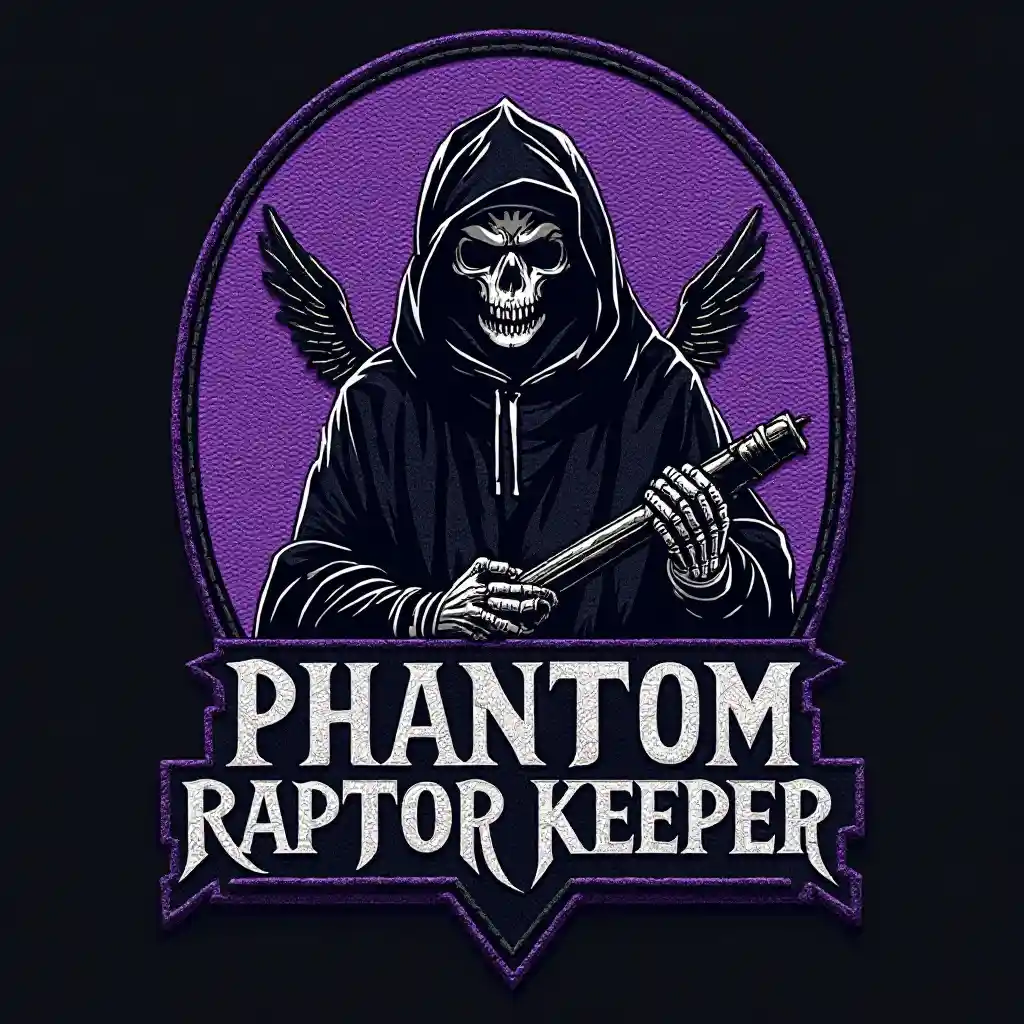 Il y a une figure cagoulée sur un badge accrocheur, avec un visage maigre, dégageant un étrange sens de l'existence. Le personnage semble attraper les griffes des rapaces, laissant entendre un lien avec les rapaces. Une silhouette osée en forme d'oiseau voûtée sur le graphique, en contraste dynamique avec le fond vibrant violet qui entoure le patch. Les mots "Phantom Raptor" sont mis en évidence ci-dessous, qui sont rendus dans des polices modernes fortes pour améliorer la beauté générale du design. La combinaison d'éléments sombres et lumineux fournit un récit visuel fascinant, évoquant le thème de la tutelle et le lien mystérieux entre les personnages fantômes et les rapaces.