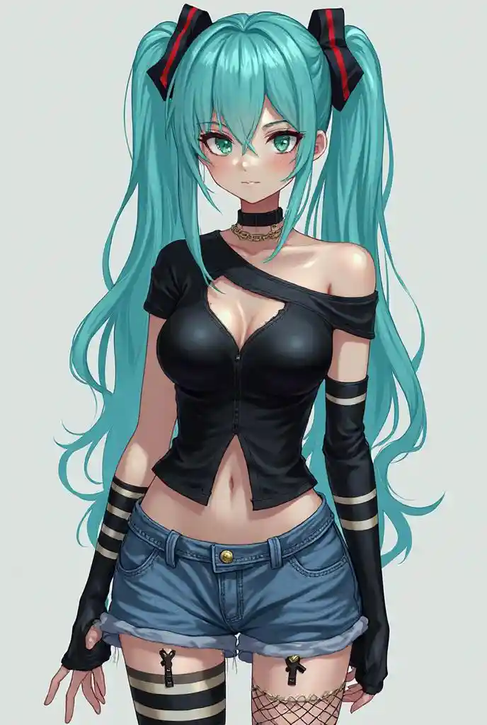 EllaLongue tresse turquoise avec nœud de papillon noir, haut noir aplani en forme de cœur, short en jean avec détails de chaîne, bas de filet de pêche, bras et jambes rayés pour réchauffer les pieds, bla