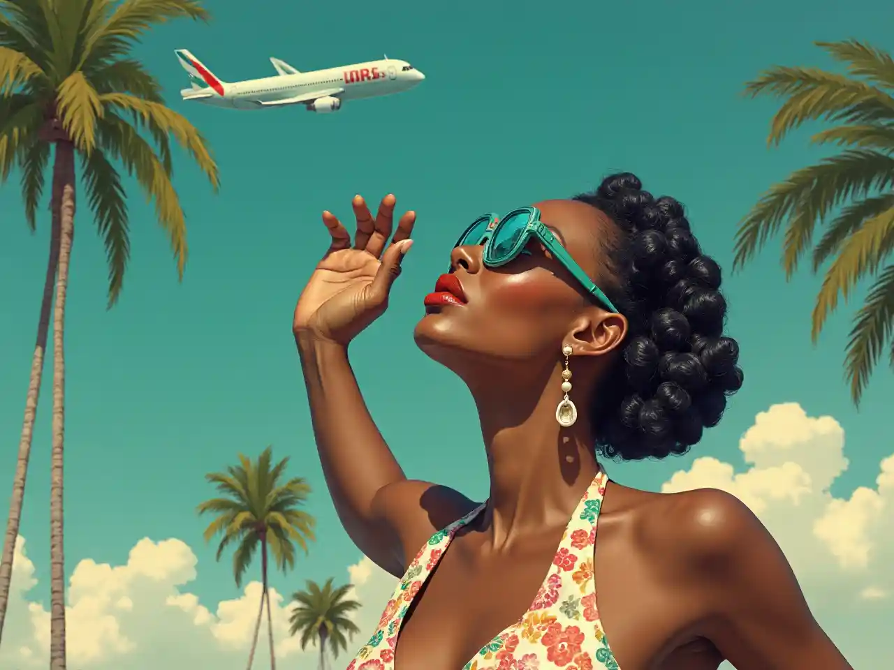 Pinin art, portrait, une femme noire lève la tête, regarde le ciel, des lunettes de soleil, un avion vole dans un ciel clair et laisse une marque, l'été, la paume entoure, la paume se reflète sur les lunettes de soleil, ton turquoise, style de Gil Elvgren