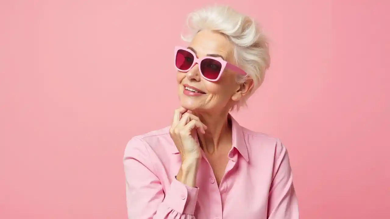 Une femme blonde et d'âge moyen pense aux choses, les mains ne quittent pas son visage, les cheveux roses, le haut rose, les lunettes de soleil roses, le style simple, la mode, la femme mature, la vieille femme isolée et impuissante, le fond rose