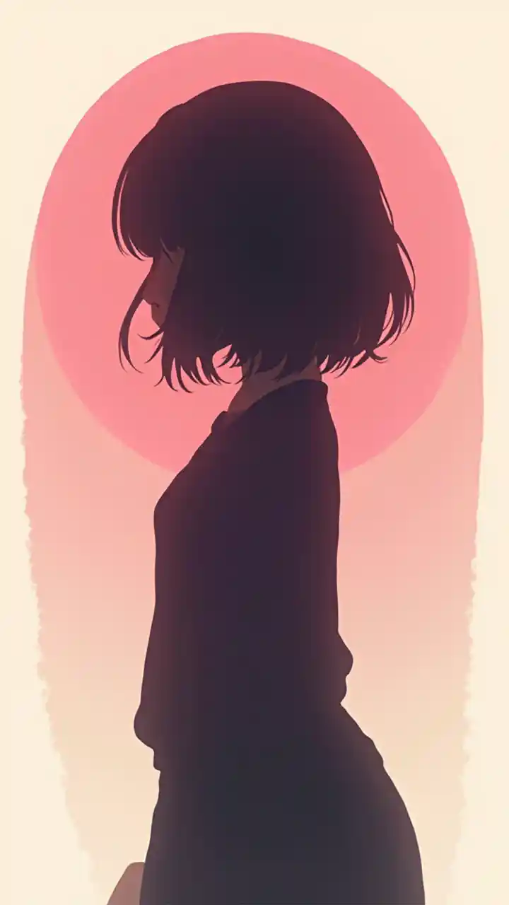 Silhouette, 1girl, solo, cheveux courts, thème rose, coupe bob, rond, plat, sans fil, fond bicolore