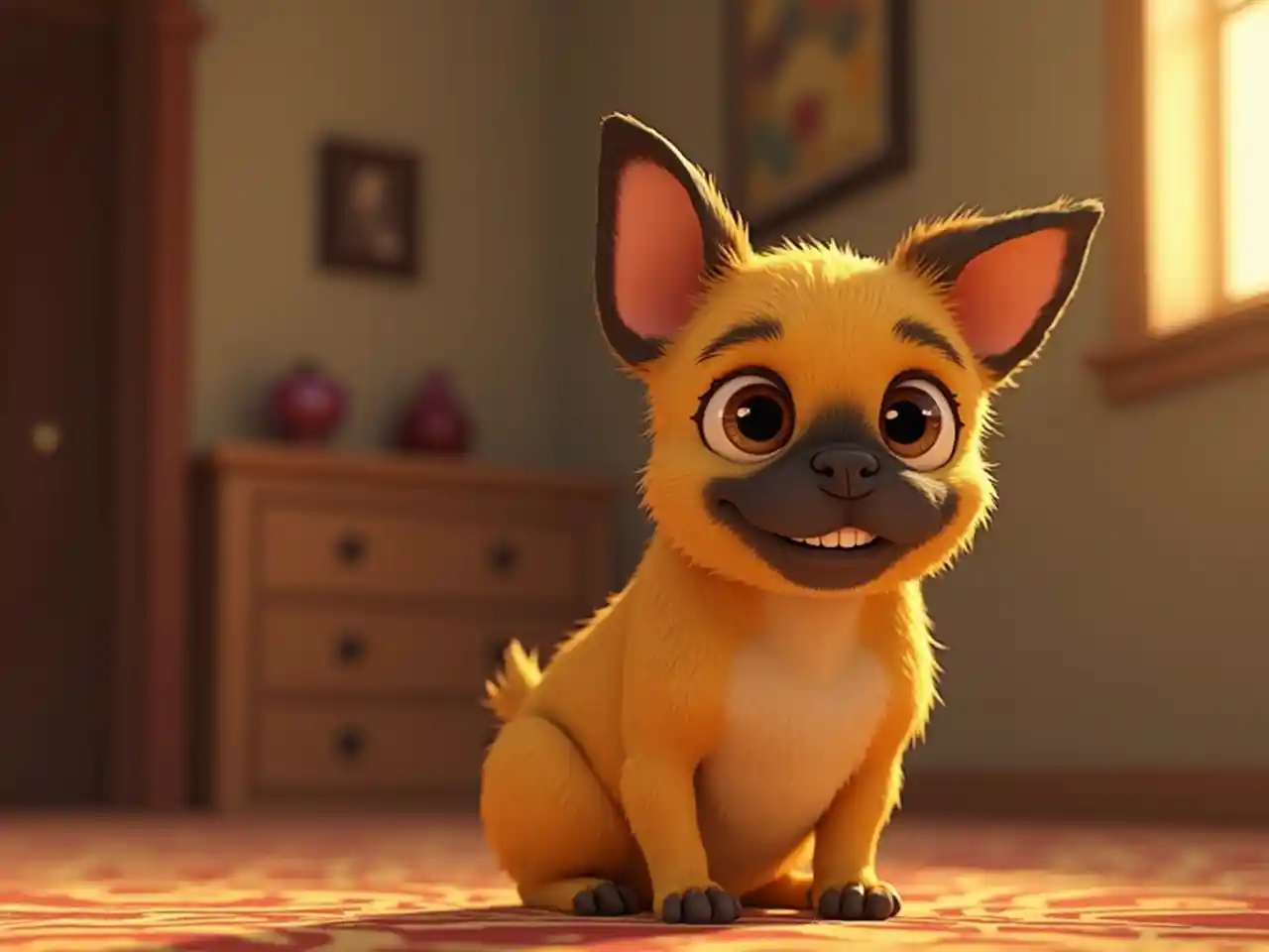 Affiche de film de style Disney Pixar, intitulée "Theodora". Sur la photo, un pitbull français jaune aux oreilles et au nez noirs, aux yeux marron et au visage souriant. La scène doit être dans le style d'art numérique distinctif de Pixar, en se concentrant sur les expressions des personnages, les couleurs vives et les textures détaillées sont les caractéristiques de l'animation, et le titre est "Bigornas".