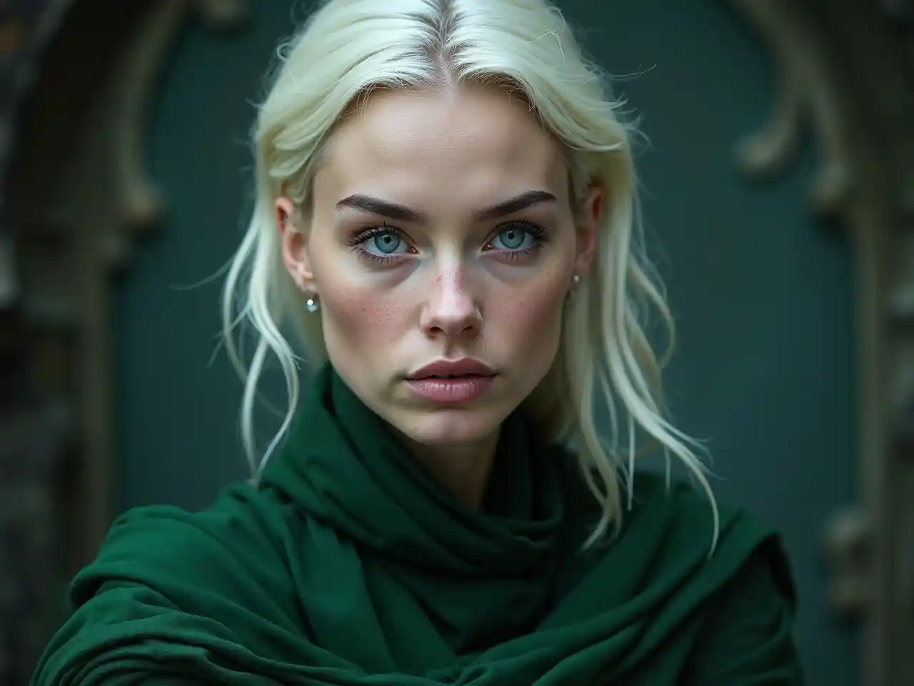 Femme aux cheveux en or blanc et aux yeux bleus en robe de Slettering