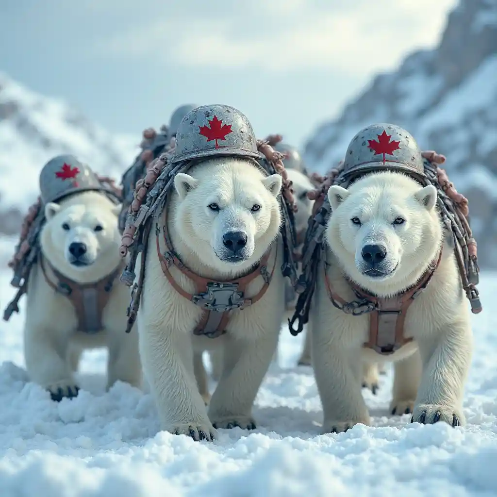 Un puissant camp d'ours arctique, vêtu d'uniformes militaires canadiens de la WW1, d'un casque militaire de la WW1 avec un emblème distinct de feuille d'érable rouge, d'ours polaires féroces et puissants, d'arrière-plan sauvage enneigé, de textures de glace et de neige, de fourrure blanche étincelante, d'action dynamique, de haute résolution, d'ultra-détails, de paysages hivernaux, évoquant la force et la bravoure, l'unité des ours, captant l'esprit d'aventure