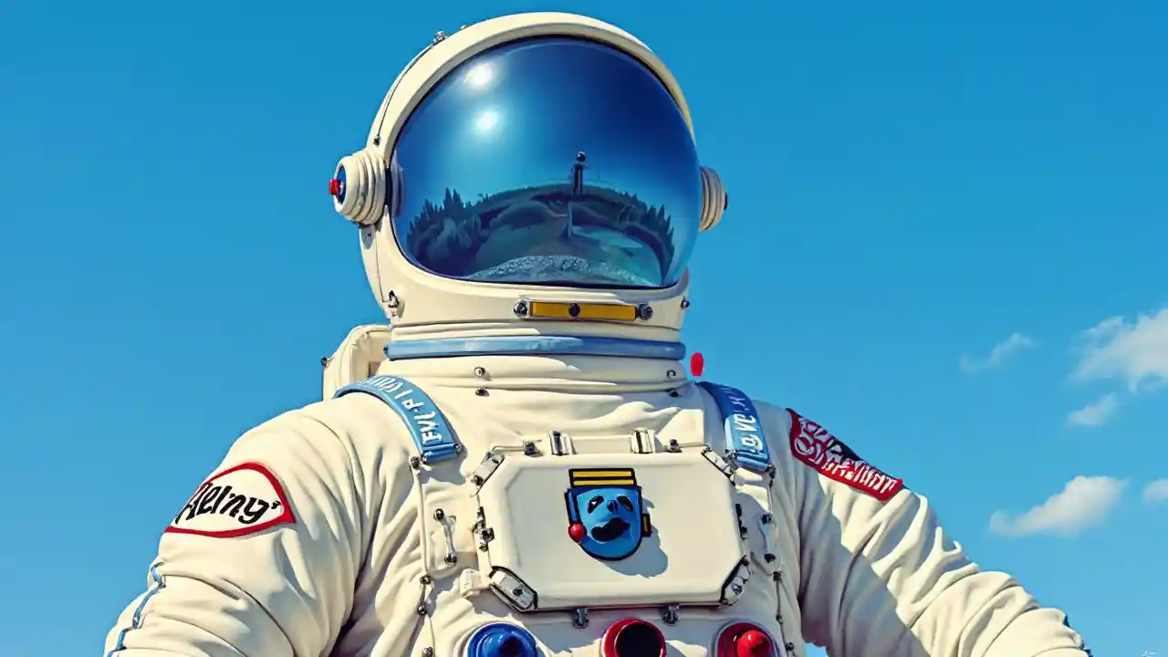 Pop art astronaute i himmel af skyer i yves Klein blå