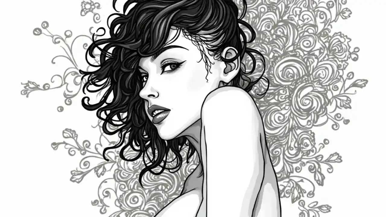 EmmaPortrait d'une femme, illustration, encre, nudité, B & W, France, style Apollonia Saintclair