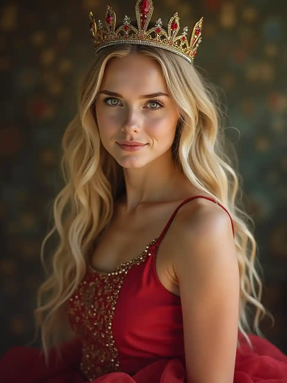 Regardez le portrait du viseur avec de longs cheveux blonds et des yeux charmants, un modèle Facecret séduisant de Victoria Sean, une robe rouge princesse, une couronne, une esthétique y2k, légère et naturelle, 4K de haute qualité, une représentation réaliste.