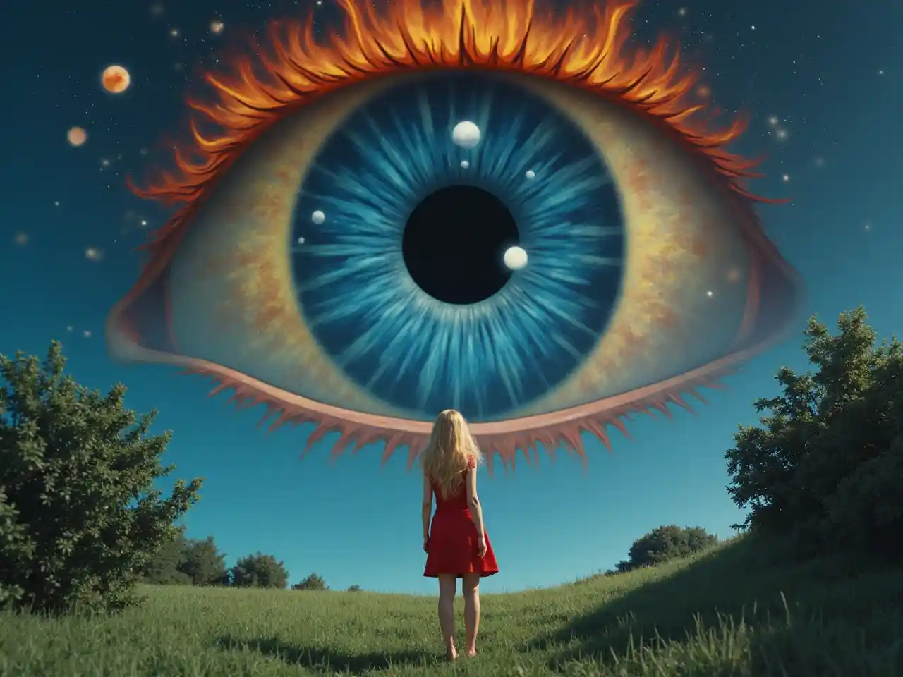 ArsMovieStill, l'image d'un film psychédélique des années 60, l'image est une œuvre d'art numérique, qui semble être la représentation surréaliste d'un œil. Les yeux sont au centre de l'image, avec un iris bleu et une pupille noire. L'iris est entouré d'une lumière orange et jaune incandescente représentant la couleur du ciel. Le fond est bleu foncé, avec des étoiles et des planètes éparpillées un peu partout. Au premier plan, il y a une jeune fille debout sur une colline, tournant le dos au public et regardant le ciel, avec une expression onirique sur son visage. Elle porte une robe rouge et de longs cheveux blonds. La colline est pleine de verdure, avec des arbres et des arbustes des deux côtés. Le ciel est plein d'étoiles, créant une atmosphère belle et sereine. La palette générale est dynamique, les tons bleu-orange et jaune oniriques., 1girl, ciel, extérieur, cheveux longs, solo, étoile (ciel), paysage, debout, arbre, herbe