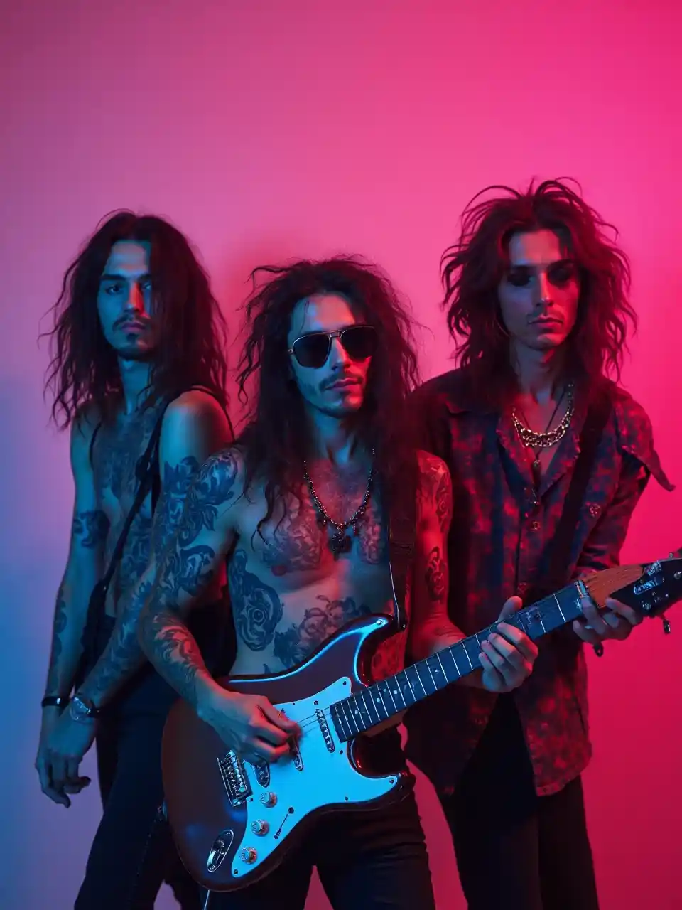 graceBande de punk metal aux cheveux longs proto 3 hommes et femmes drôle, rose néon et bleu néon