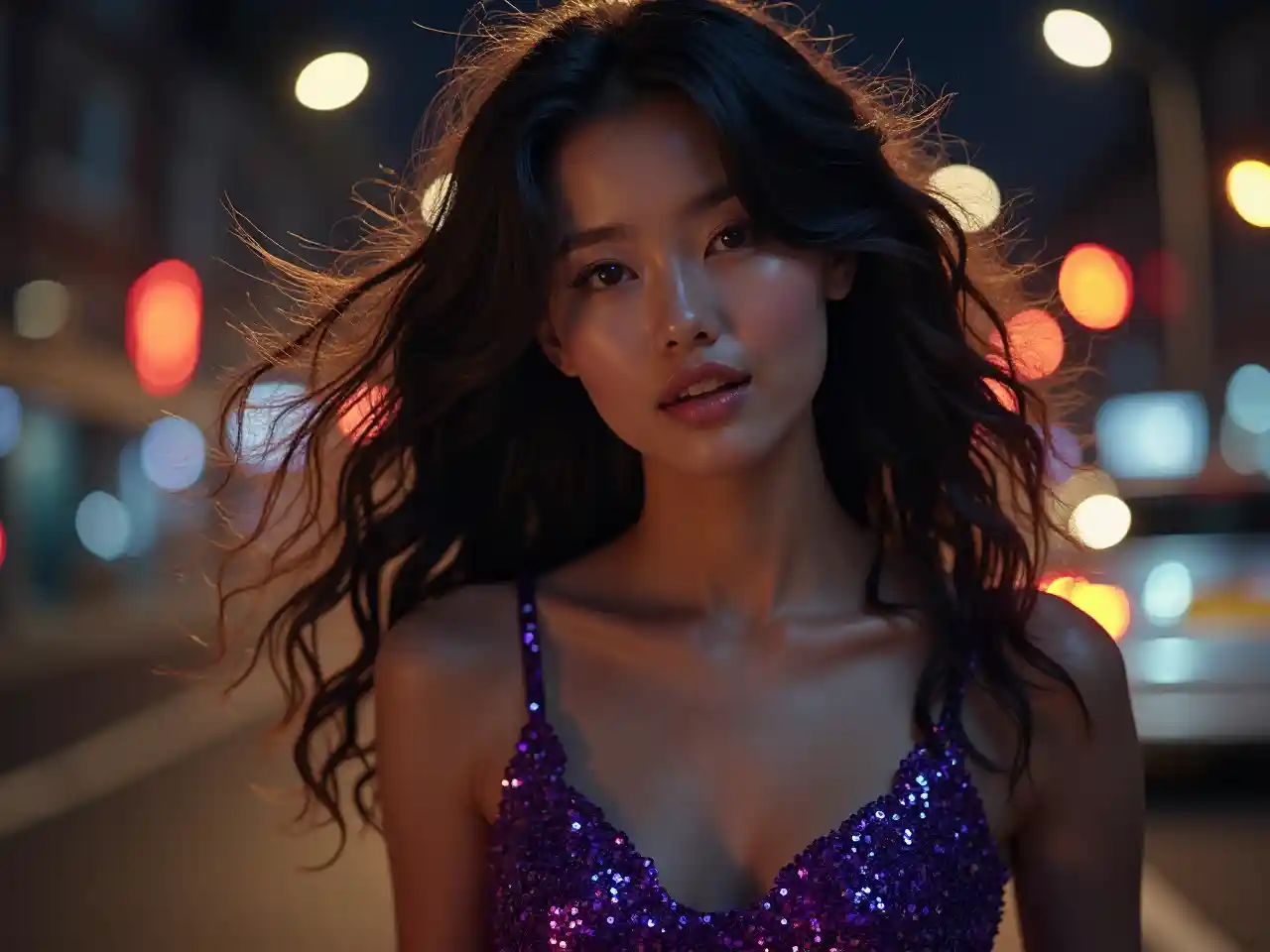 Une super-mannequin de beauté coréenne dans une robe à paillettes violette. La nuit, elle pose dans la rue, ses longs cheveux bouclés flottant au vent, elle ouvre la bouche et regarde directement la caméra avec un sourire tendre. Avec une focalisation nette et une haute résolution, la photo a un look cinématographique qui rappelle celui de Fujifilm. Le v5 s20 ultra grand-angle original crée un effet dramatique.