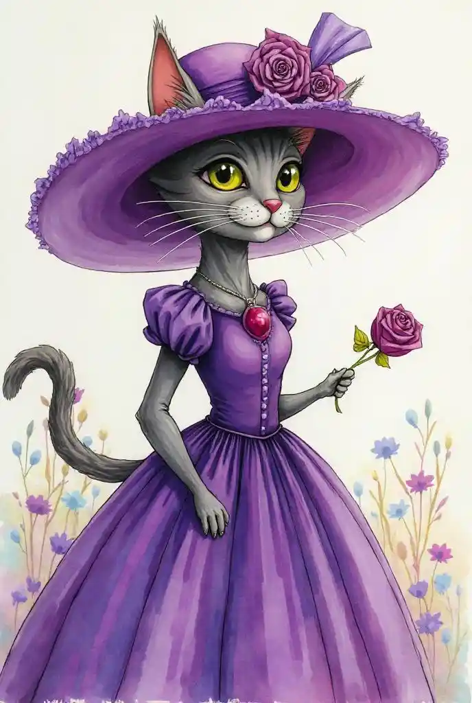 Sophia(Chat élégant, princesse, robe violette, grand chapeau violet, rose violette), style livre d'images, aquarelle, monde du livre d'images, fantaisie, art psychédélique d'Alphonse Mook