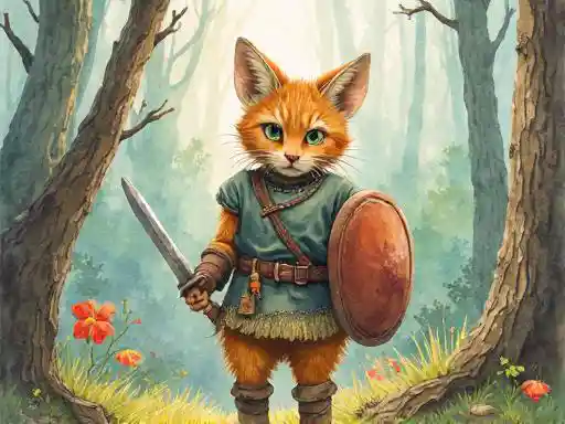 NoahLe chat en bottes, debout avec un bouclier d'épée, la forêt en arrière-plan et une hutte debout derrière lui, l'aquarelle, les couleurs tachées