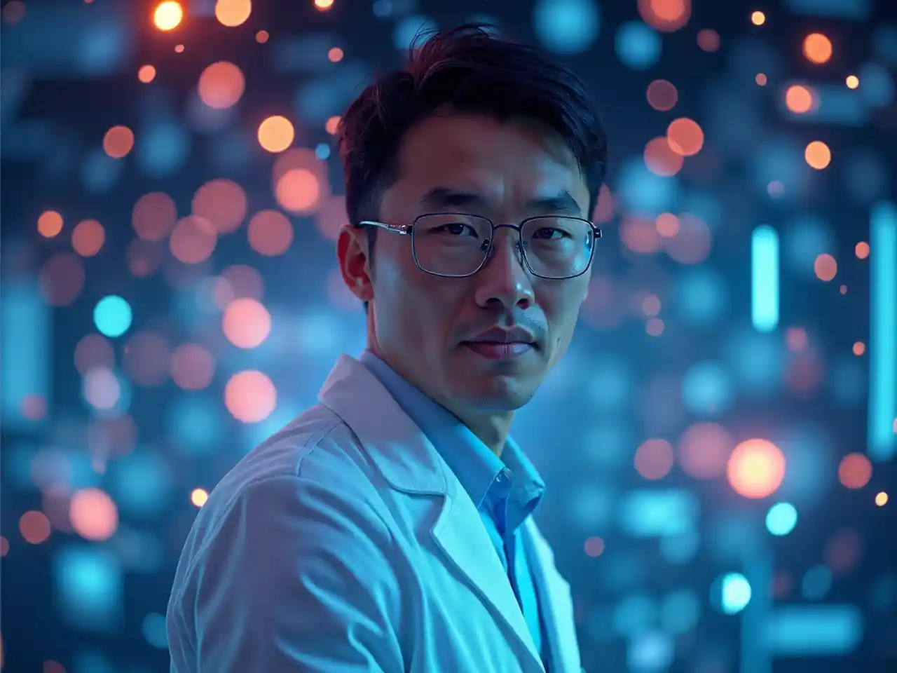 Un Asiatique de 45 ans dirige une équipe de recherche quantique dans un laboratoire de néon, vêtu d'une veste de laboratoire lisse et radieuse. Les particules lumineuses et les équations holographiques l'ont encadré, et sa concentration visionnaire et son intelligence vive rayonnent d'innovation de pointe et de charme scientifique.