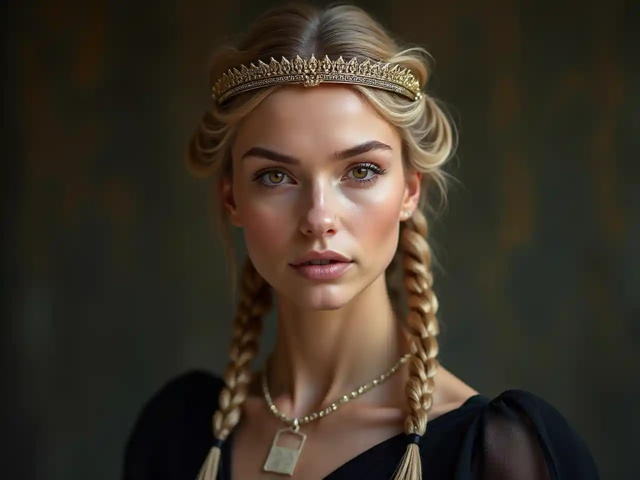 Femme reine, cheveux blonds, yeux marron, robe noire, couronne dorée mince sur la tête, détails très méticuleux et tranchants, ultra-réaliste, objectif de 50 mm, traits du visage réalistes, portrait complet du corps