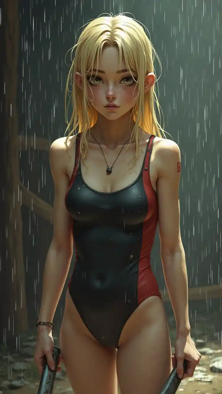 Une vilaine fille blonde debout sous la pluie, ses cheveux mouillés collés au visage, son aspect est neutre Naturellement, elle se tient dans une grange, vêtue d'un maillot de bain de course. Une autre fille aux cheveux châtains tient une pelle.