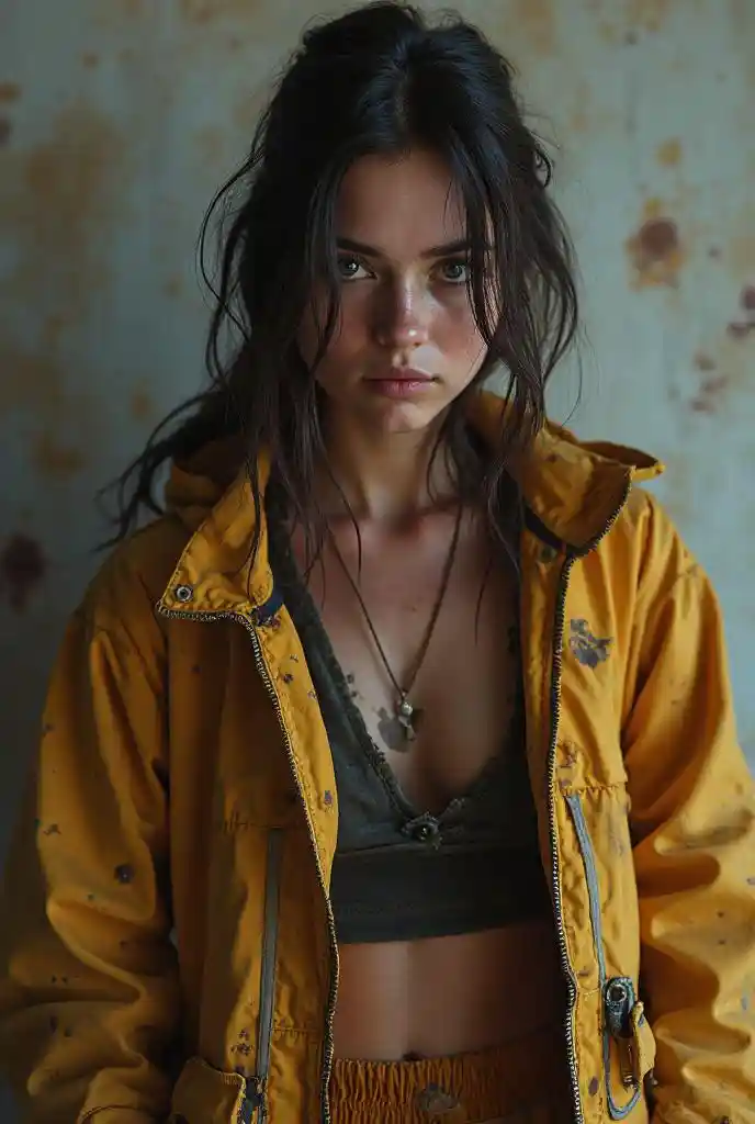 JocelynSlash et image crédible d'une fille triste vêtue d'un costume ignifuge déchiré et sale dans le style maxmix, à base d'un "2015 F" rouillé et sale des temps modernes