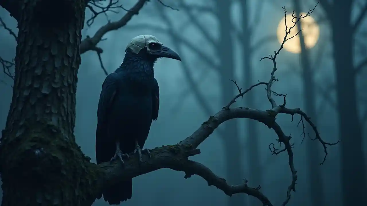 Créer l'image d'un corbeau, assis sur un arbre avec une branche dans un environnement très morose. La zone est illuminée par la lune, sans voir la lune, il y a un sentiment de mystère. La tête d'un corbeau est un crâne. Cette scène ne ressemble pas à un film d'horreur.