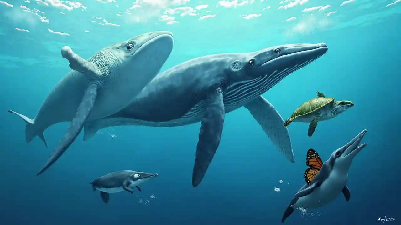 Image animale réaliste: la baleine bleue au dauphin d'Hector