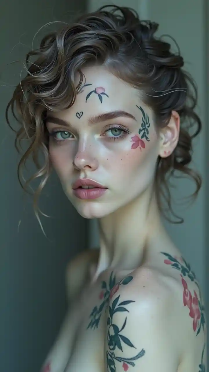 Une femme de 21 ans défoquée, réaliste, réaliste, réaliste, une belle photo!!! Esthétique!!! Jeune jeune femme tatouée et pâle, peinture corporelle, très floue, peau à moitié claire, yeux fermés et brumeux, visage ultra-réaliste, effet réaliste, yeux perfETC, bord parfait, corps et cheveux perfETC ultra-réaliste, détails superbes cheveux, visage réaliste, visage parfait, anatomie parfaite, objectif complet, tatouage