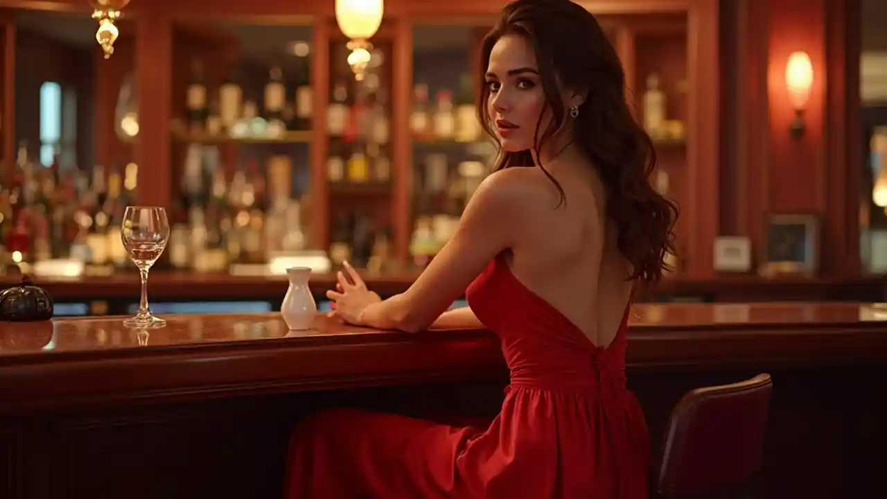 Générer la scène d'une femme vêtue d'une robe en satin rouge sexy, assise dans un bar luxueux. La robe s'accroche à ses courbes et la douce lumière des lumières du bar jette une lumière chaude, séduisante sur sa silhouette.