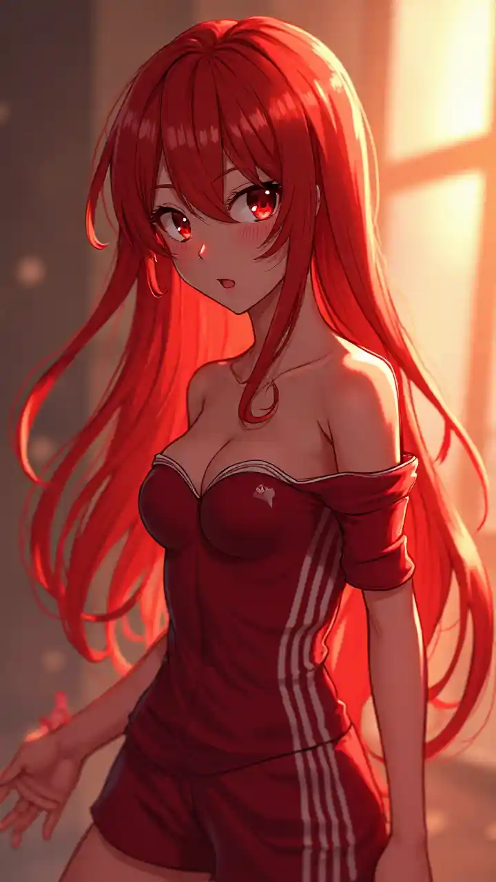 Oliver(Chef-d'œuvre, la meilleure qualité), 1 fille cheveux longs rouges, yeux rouges chauds, vêtements de football en perspective rouge, pas de soutien-gorge.