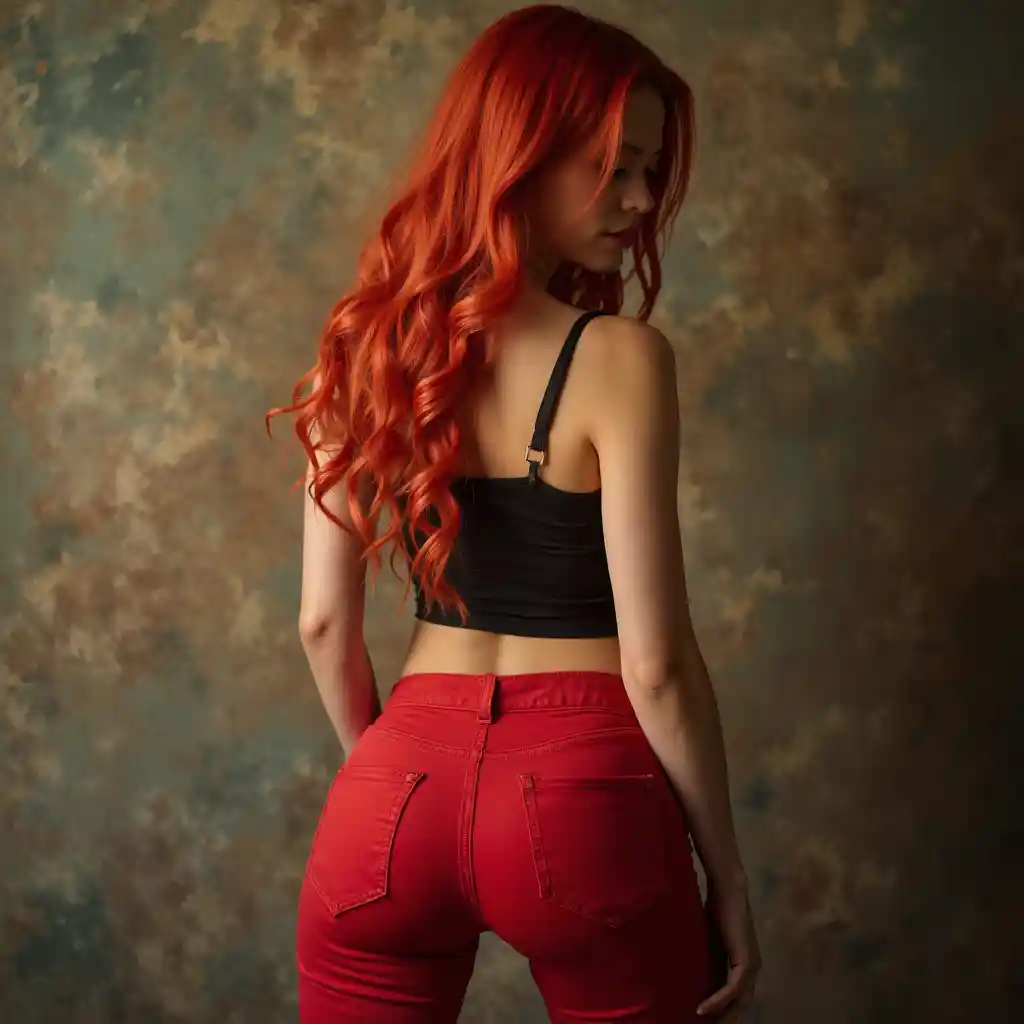 GrimTête rouge chaude avec gros cul et pantalon rouge