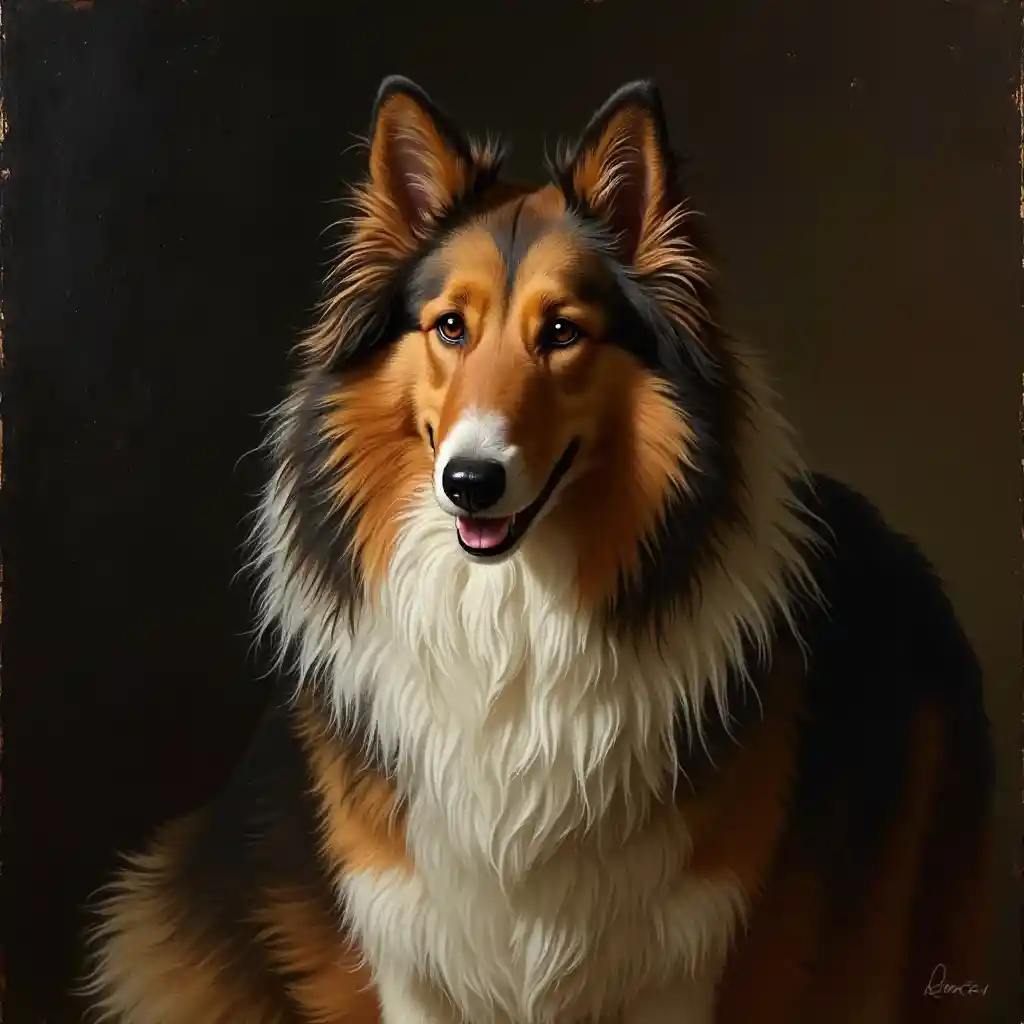 Un tableau célèbre de Rembrandt Van Rijn, portrait d'un chien de berger grossier, costume typique de l'époque, style de peinture Renaissance, perspective 2/3, fond simple, taille vers le haut, détails élevés, contraste élevé