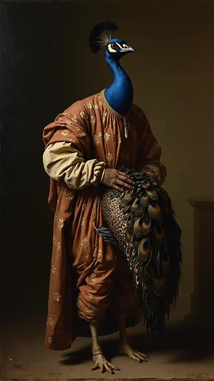 Le tableau représentatif de Rembrandt Van Ryan, portrait d'un paon indien, est typique du costume de l'époque, style de peinture Renaissance, perspective 2/3, fond simple, taille vers le haut, détails très clairs, contraste élevé
