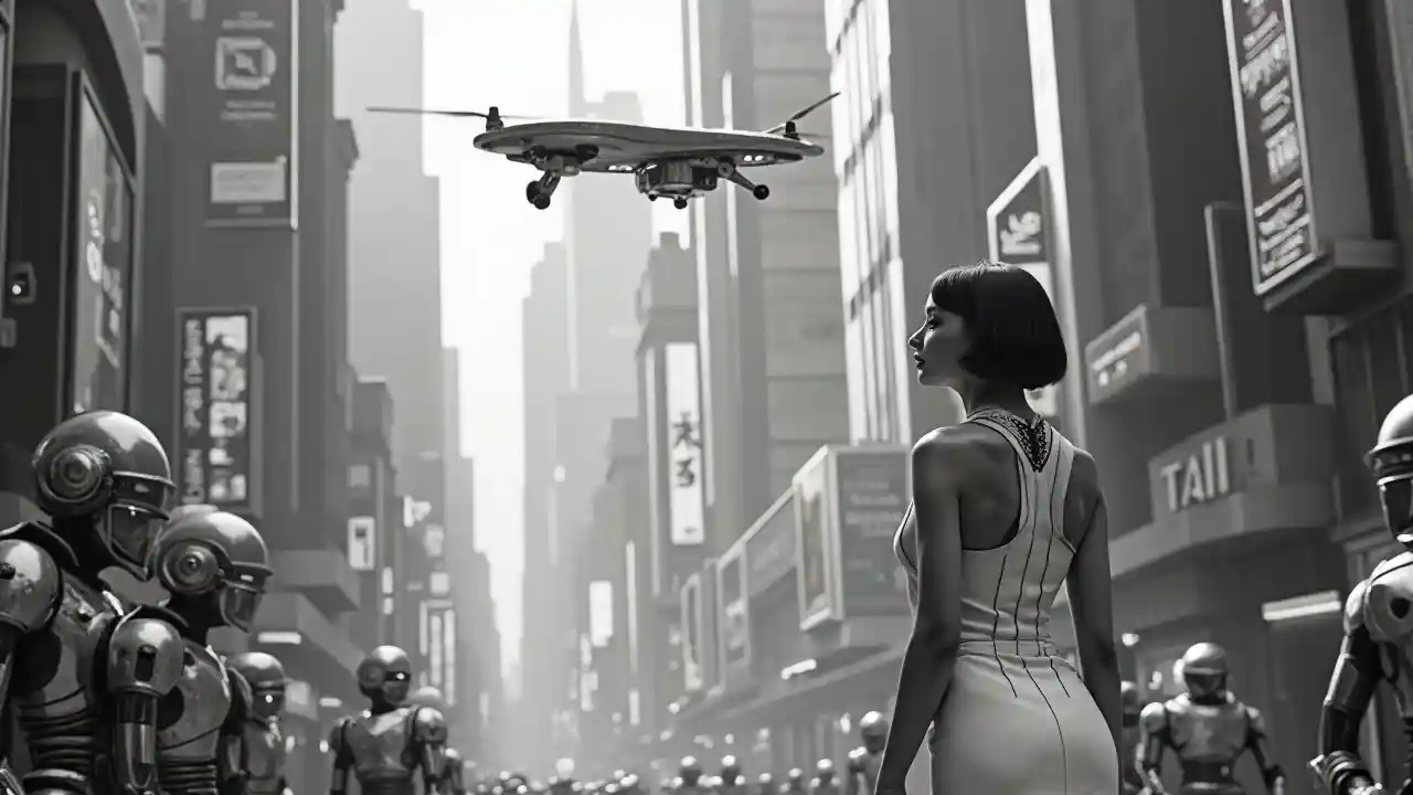 1: Une femme humaine portant une robe élégante de style des années 1960 et une coiffure de bobo rétro se promène dans les rues futuristes de la ville, remplies de robots chromés et d'imposants gratte-ciel. La conception de ces bâtiments combine des éléments arts décoratifs anciens et futuristes, et les enseignes néon projettent une lumière terne. La robe de la dame était blanche avec un accent noir. Elle a levé les yeux et a jeté un coup d'œil à un drone survolant au-dessus, dont la surface métallique brillait sous une lumière douce. Les images ont un look noir et blanc à fort contraste, avec des ombres exagérées et des surbrillances qui font vivre l'esthétique rétro.