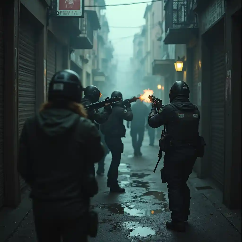 Se cachant furtivement dans les coins des ruelles sombres, ils doivent se cacher, sinon les robots éliminateurs les retrouveront, la révolution féminine, les scènes de guerre chaotiques. Poussiéreux, brumeux, pluvieux, nombreux, femmes armées de fusils, tirs