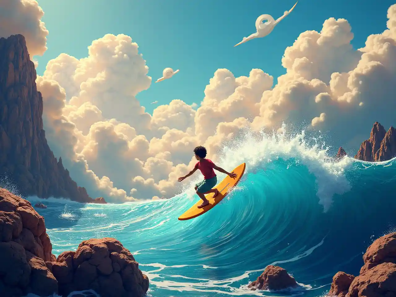 (Style surréaliste) Richard chevauche la scène fantasque d'une planche de surf, des couleurs vives et des paysages oniriques l'entourent, (des nuages flottants) et (des vagues tordues) se mélangent (des éléments fantastiques), des tons ludiques, un fort contraste de lumière et d'ombre, une atmosphère mystérieuse, (4K), des ultra-détails avec une texture enchanteresse.