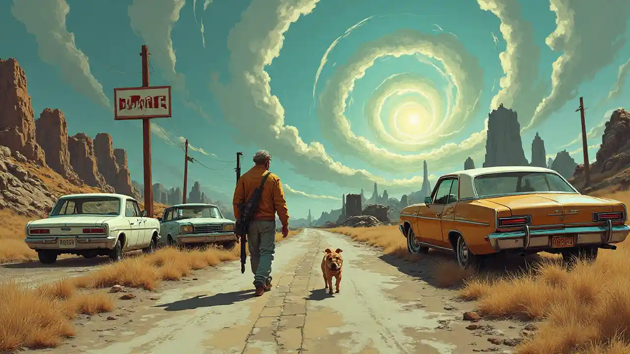 Des hommes arpentant des carabines et des chiens dans des voitures abandonnées, signant des autographes sur la route; des bâtiments en ruine et un ciel tourbillonnant en arrière-plan, style art de science-fiction et fantastique des années 70.