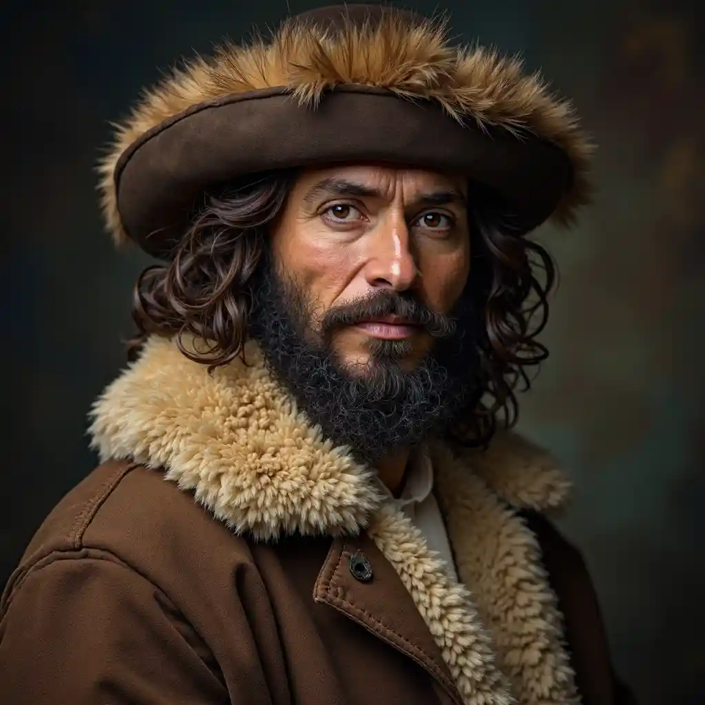 Portrait de Robinson Crusoe, vêtu d'une casquette en fourrure et d'un manteau de fourrure