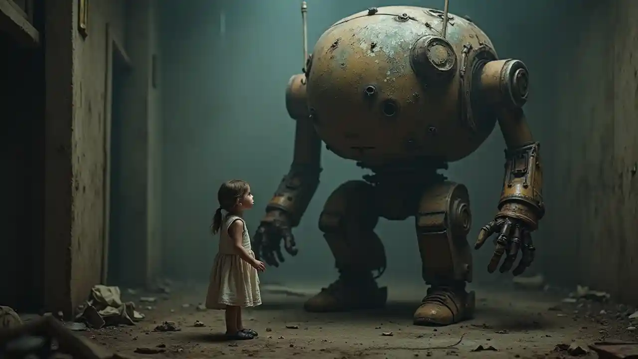Une fillette de 4 ans avec un robot grand, vieux et rouillé, une pièce sombre, une lumière tamisée, de la poussière, de la toile d'araignée, de la rouille, de l'hyperréalisme, des détails au maximum, de la brume,