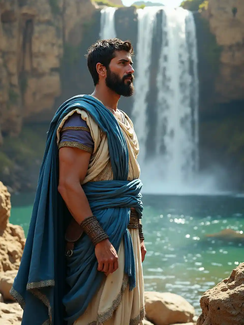 Un homme romain de 40 ans, vêtu d'une tunique de bouquet bleu et blanc typique de la Rome antique, contemple un morceau de cascade, la période de l'Empire romain, le contexte historique du Ier siècle et le style de peinture.