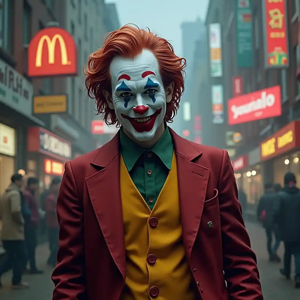 ColtonImage du clown de Ronald MacDonald avec le logo emblématique de McDonald's, panneaux d'affichage et arrière-plan fantastique