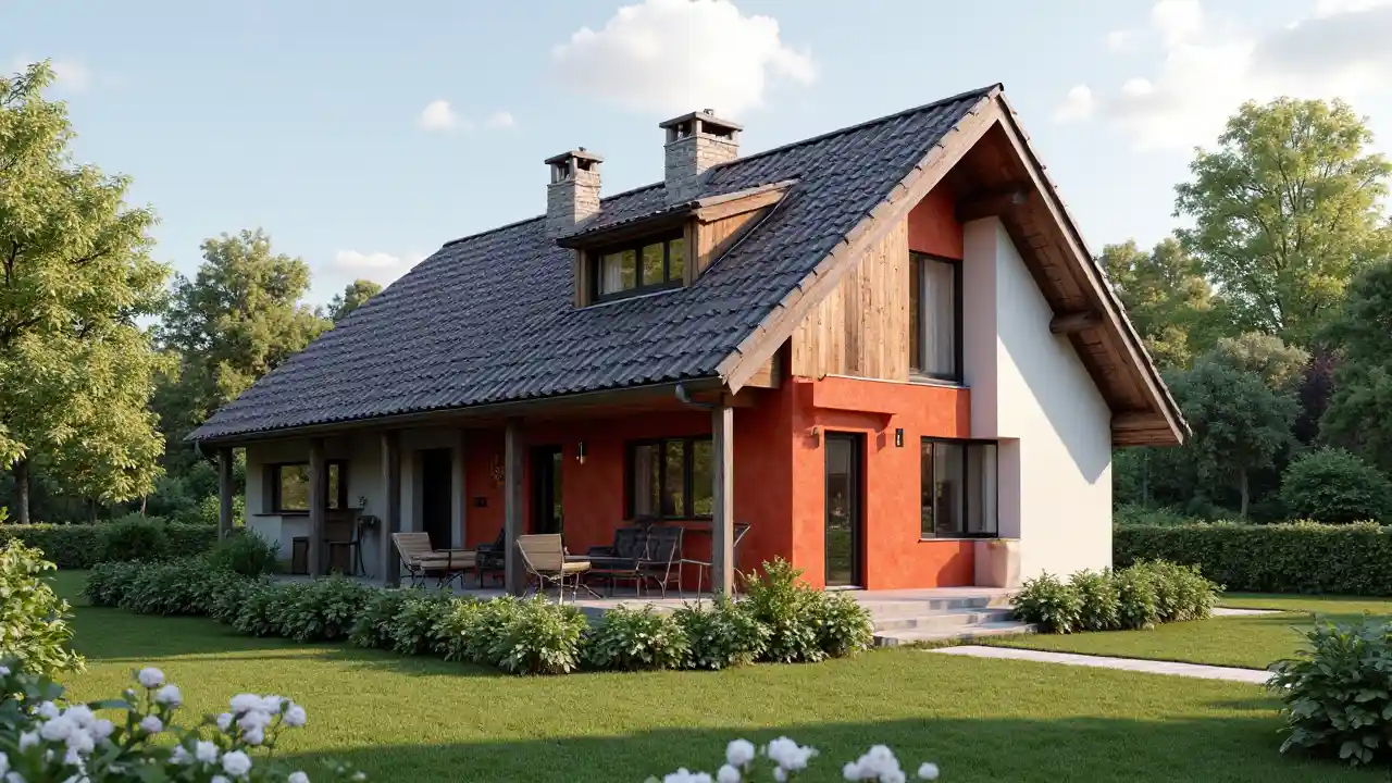 stworz realna postac dekarza stojacego na budowanym dachu a w reku trzyma drewniany kij z flaga bialoczerwona