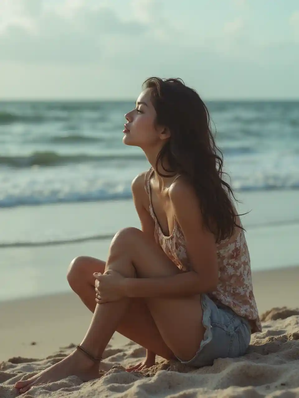 ZoeCréer la plus belle femme pauvre assise sur la plage en fronçant les sourcils