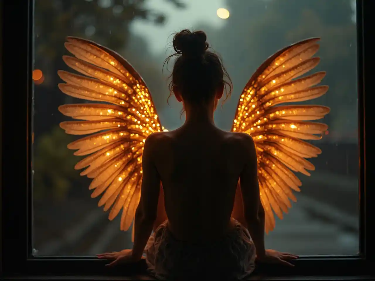 La silhouette de la fille au visage triste est associée à un chignon en désordre et à d'énormes ailes d'ange lumineuses (((paysages étincelants, plumes d'automne, style rêveur, feuilles de galaxie de style fantaisie sombre la nuit, et l'ouverture d'un autre monde magique, il y a une silhouette lointaine qu'une femme cherche partout)), assis près de la fenêtre un jour de pluie, vous ne pouvez pas voir les détails de la voiture. C'est juste une silhouette sombre à l'extérieur d'un jour de pluie sombre, juste un petit éclair de la goutte de plu. Les faisceaux dorés se reflètent autour d'elle, scintillant l'énergie infinie des étoiles.