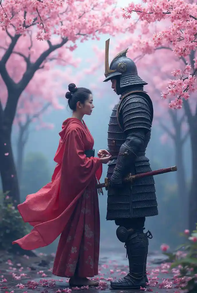"Les vestiges du champ de bataille avec des fleurs de cerisier partout sur le sol: l'armure de samouraï brisée brille d'une lumière bleue fraîche sous la pluie de cerisiers en huit coups, et un kimono écarlate se rencontre