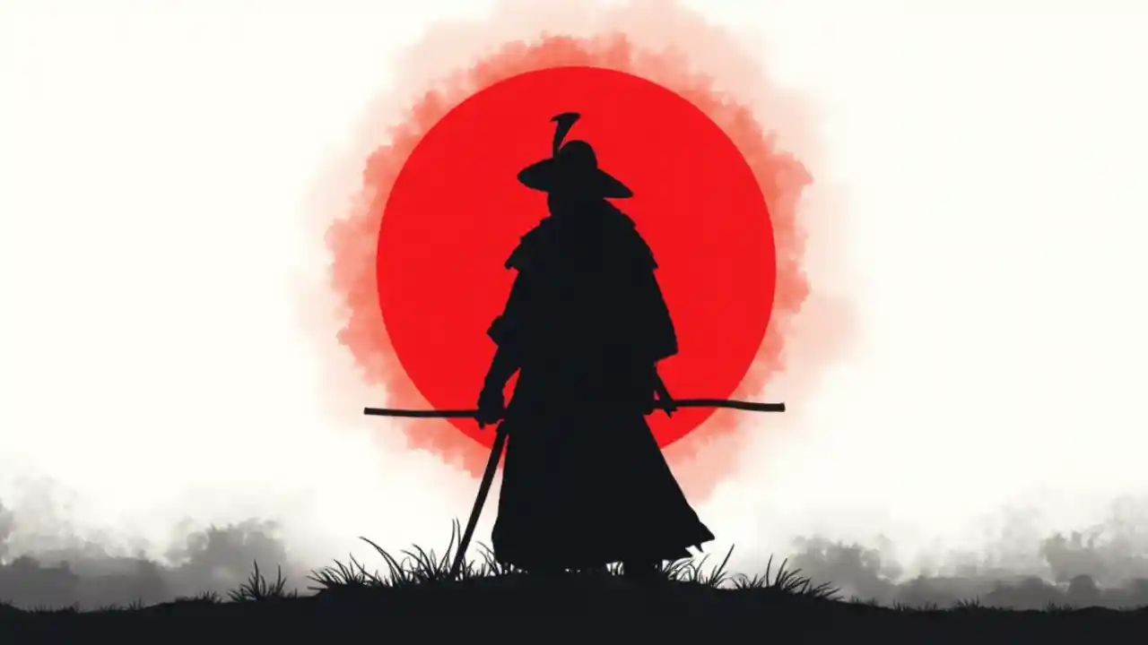 Silhouette d'un samouraï, debout, sur fond de soleil rouge, fond symétrique, minimaliste blanc, art numérique.