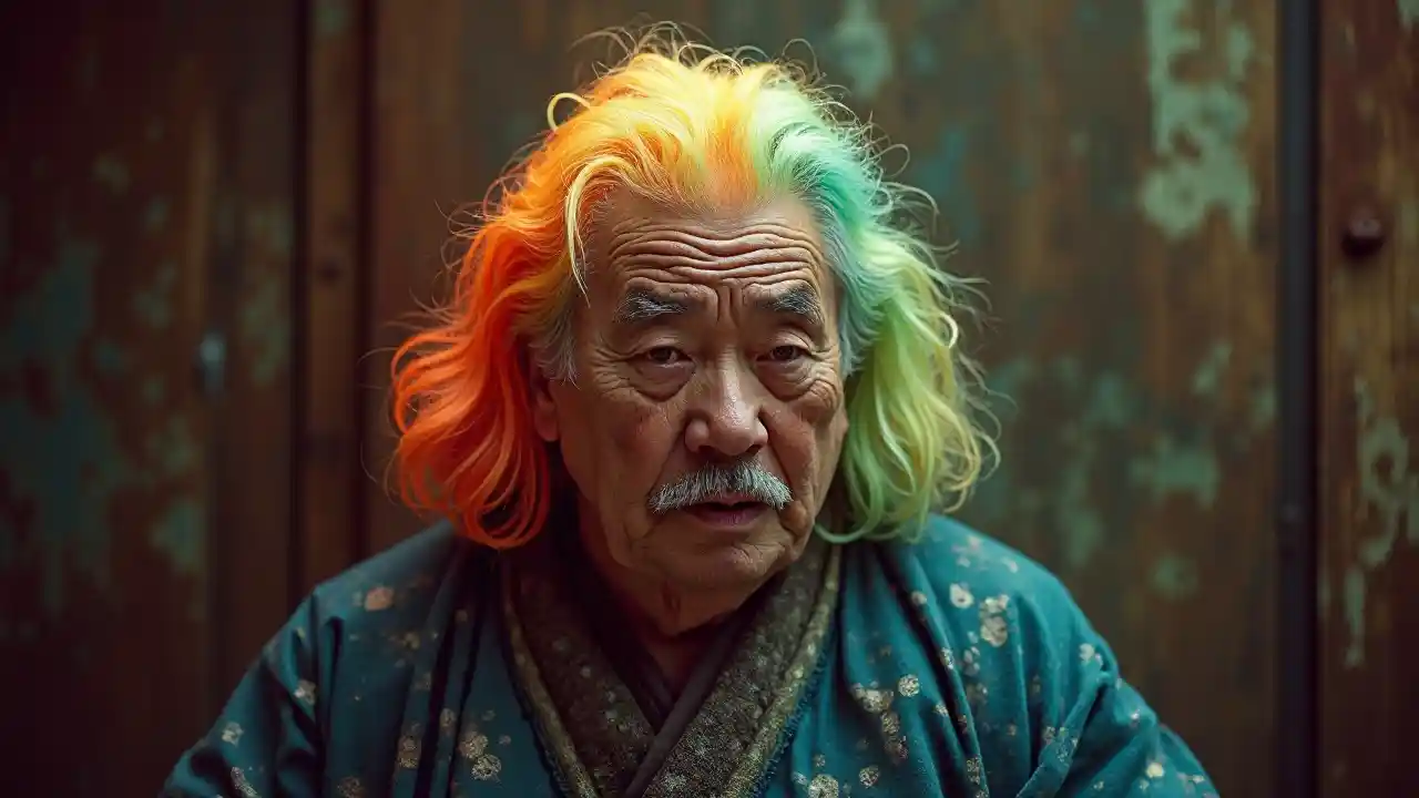 Lumière du jour, samouraï aux cheveux arc-en-ciel, vieillard obèse, style portrait photographique primé, (bizarre: 1,3), minimaliste. Style de portrait documentaire dramatique, grand format, granulés de film, film Superia X-TRA 400 encore