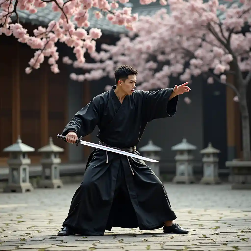 Des danses de l'épée sont jouées dans la cour des samouraïs et des hommes blancs d'une vingtaine d'années brillent dans des gi noirs. Les fleurs de cerisier et les lanternes de pierre l'encadrent, et ses mouvements précis et sa silhouette musclée dégagent une énergie forte et gracieuse dans un environnement traditionnel et serein.