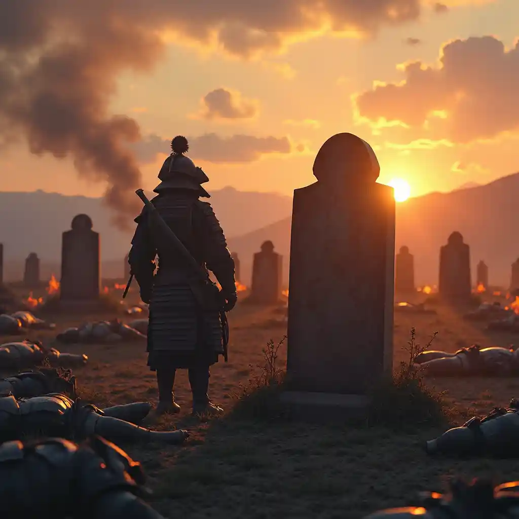 Création au milieu du champ de bataille de l'image d'un samouraï adossé à une pierre tombale banalisée. Le sol brûle toujours et les alentours sont jonchés de nombreux combattants tombés. Les samouraïs regardent au loin sous le soleil couchant