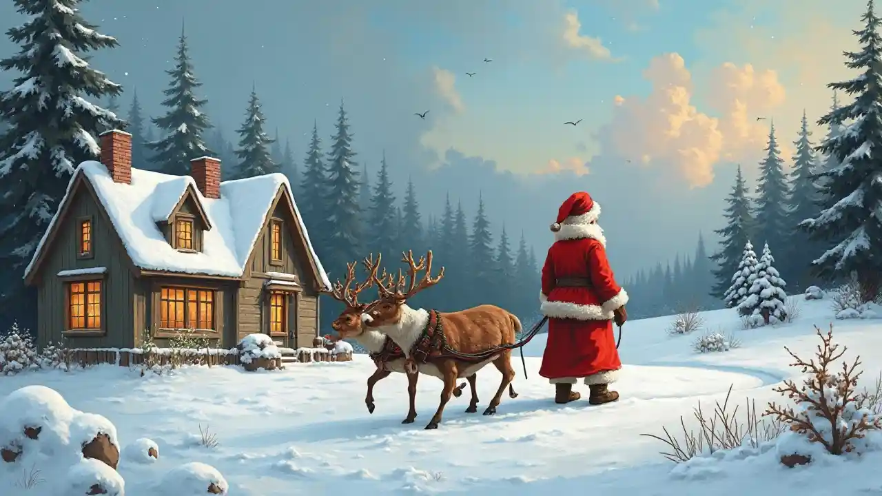 GracePeindre le père Noël et la voiture de rennes à côté de la maison de campagne.