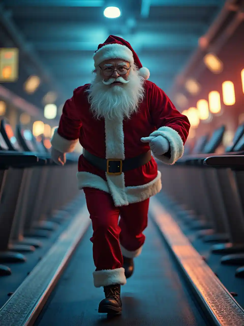 GraceLe père Noël qui court sur tapis roulant, de face, saturé en 4k ultra réaliste