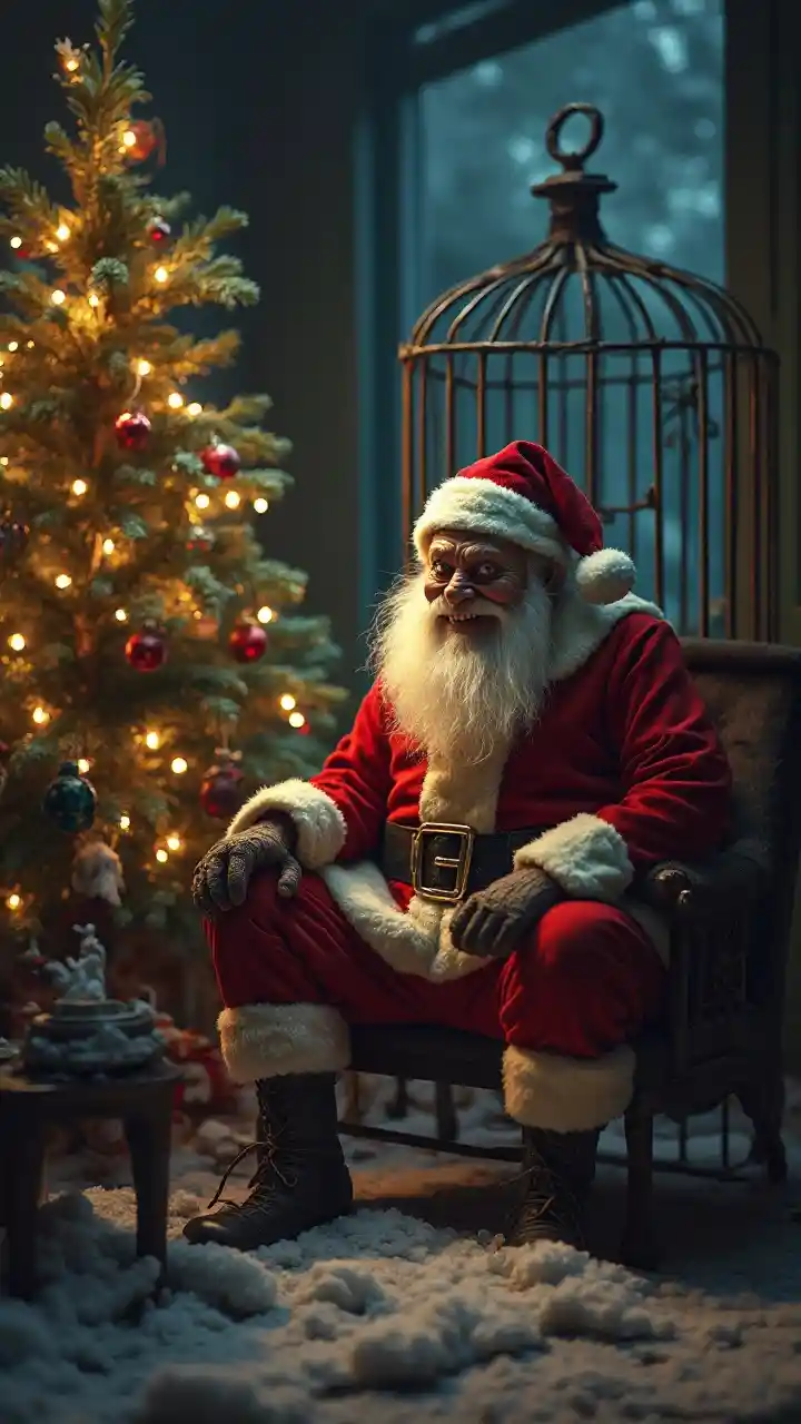 Scène de Noël, le Père Noël est très heureux et a l'air normal, on voit un troll au look très furieux et affreux dans une cage dans un coin à côté du sapin de Noël