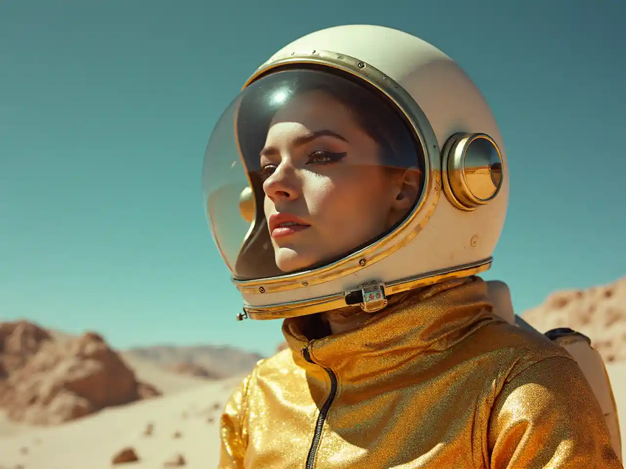 Une photographie d'une femme astronaute des années 60 sur la planète Santorin