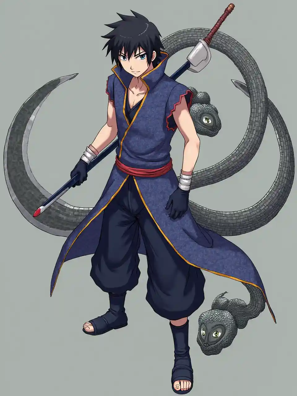 OliverAnime, Homme, détail, cheveux de Sasuke, cheveux noirs, armure de serpent, très détaillé, faucille à la main, ninja, bottes, guerrier orochi
